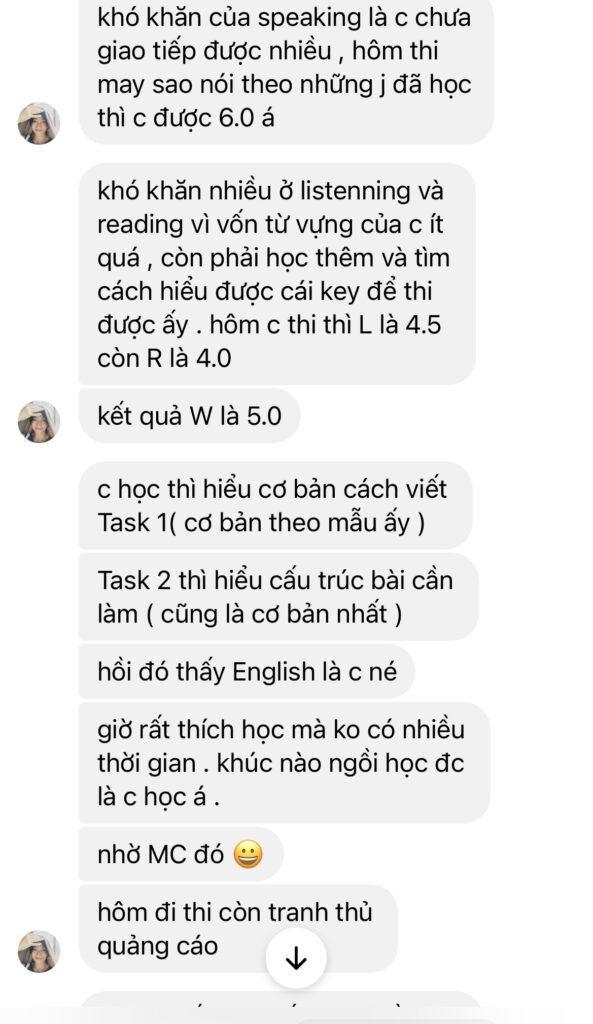 Xuất phát điểm chưa học IELTS bao giờ và mục tiêu của chị chỉ là 5.0 nhưng sau 2 tháng học đã thi đạt luôn 5.5. Trong đó S5.5 và W đạt tận 6.0.
