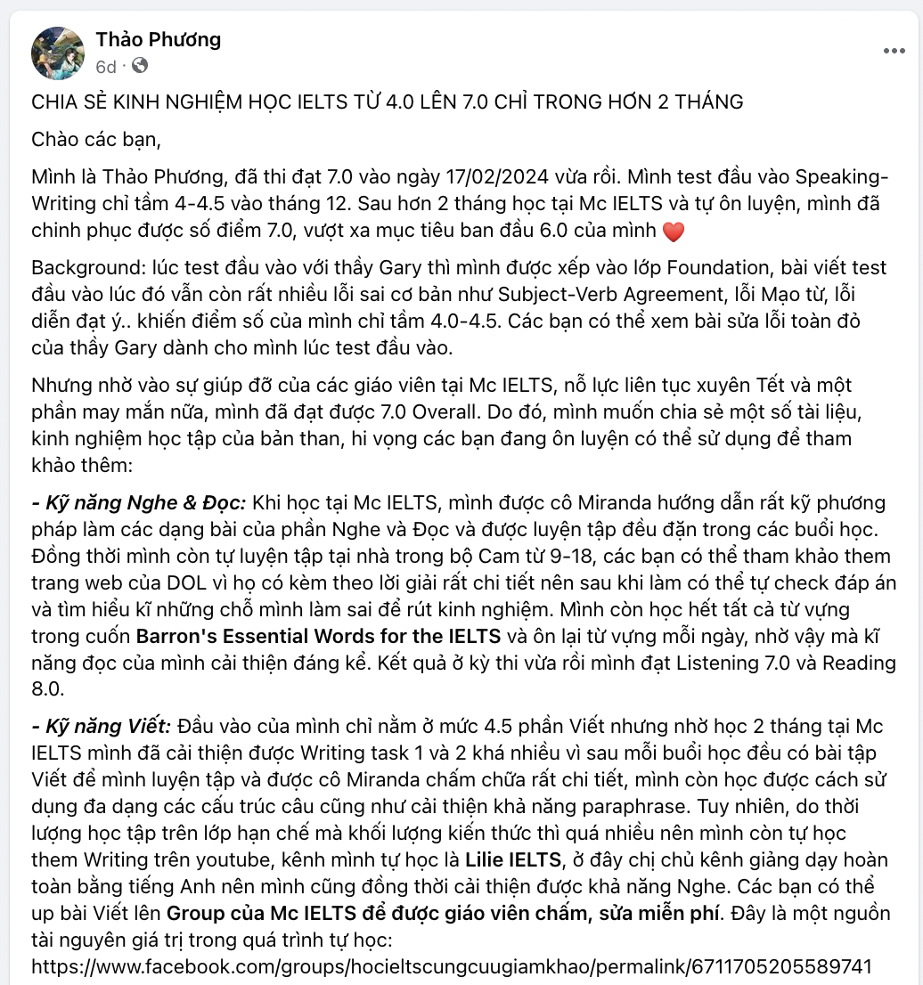 Xem thêm bảng vàng thành tích các học viên tại Mc IELTS