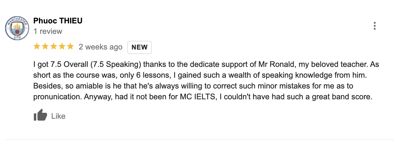 Chúc mừng bạn Thiều Quang Phước đã đạt Speaking 7.5 sau khóa học Speaking Coaching với thầy Ronald.