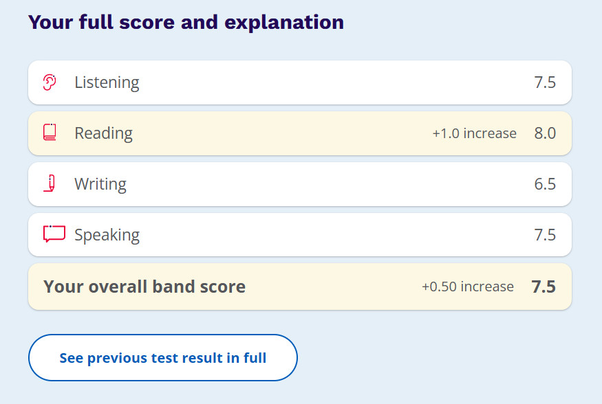 Điểm số Overall 7.5, đặc biệt trong đó Speaking 7.5 thật sự rất ấn tượng!