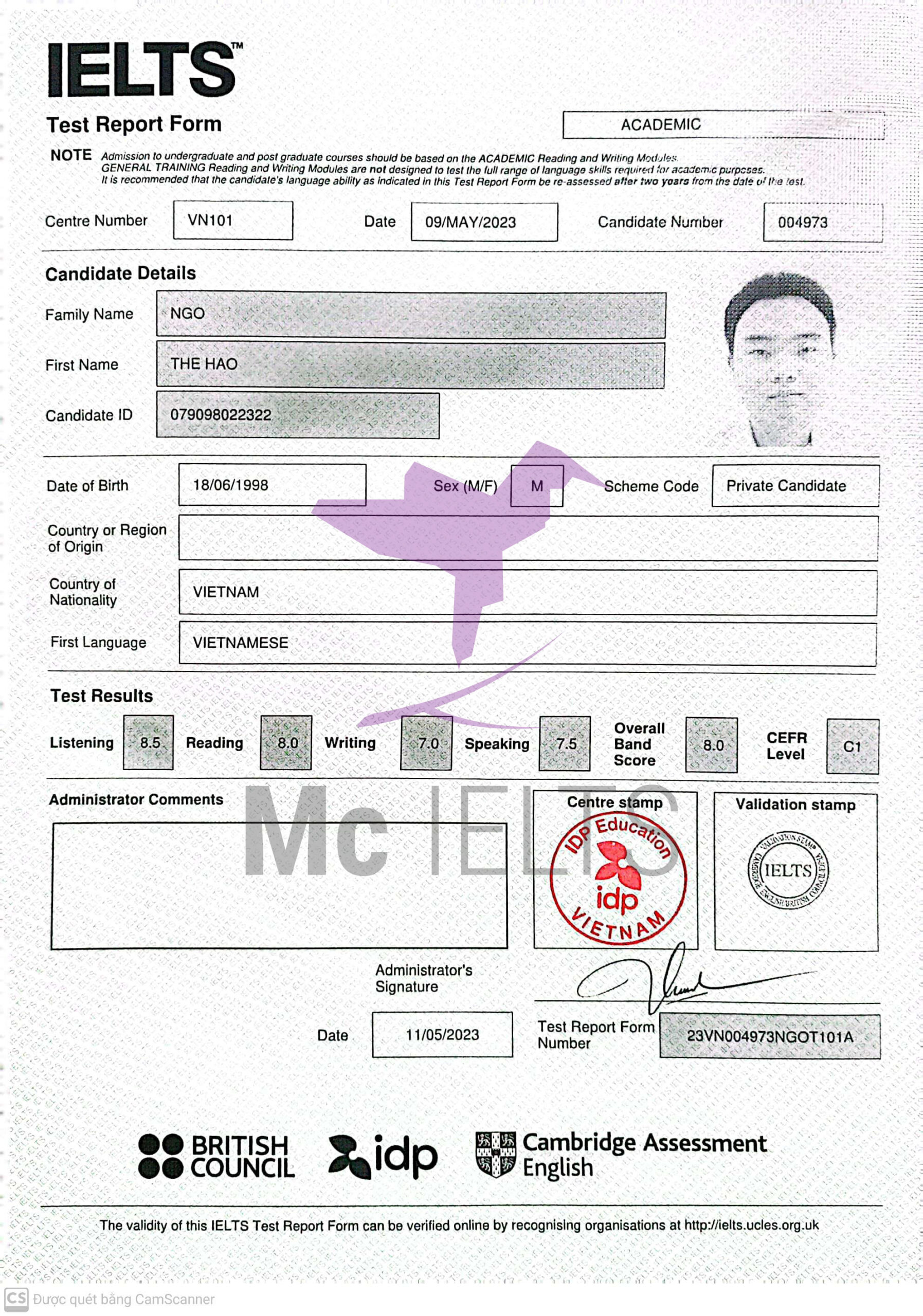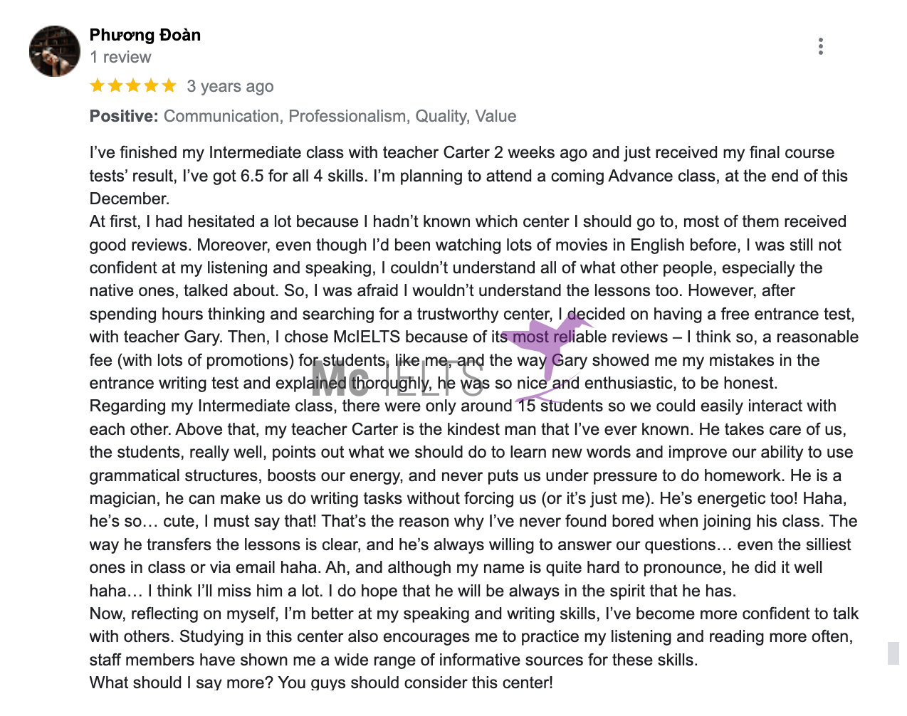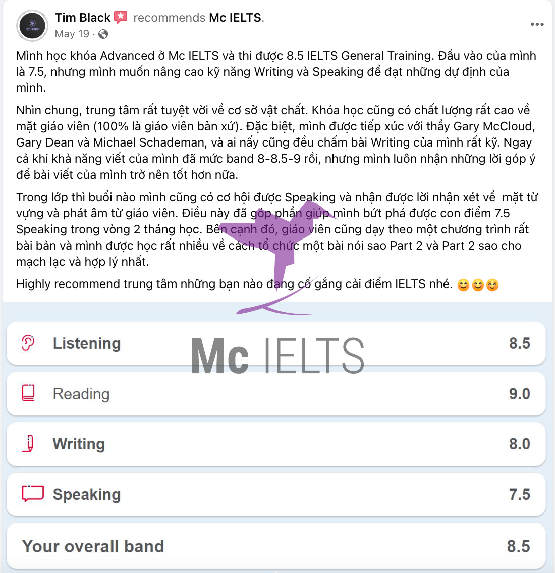 Bạn Tim Black cũng là một nhân vật rất nổi bật trong giới IELTS. Bạn ấy cũng lựa chọn Mc IELTS là nơi cải thiện điểm số và đã xuất sắc ghi điểm 8.5.