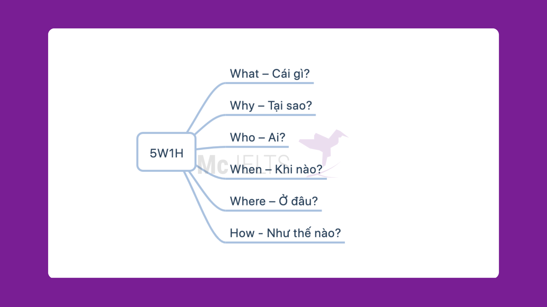 Phương pháp 5W1H là công cụ hữu ích giúp bạn chinh phục điểm cao trong bài thi IELTS Speaking Part 2. Hãy áp dụng phương pháp này một cách hiệu quả để tự tin trình bày bài thi và đạt được kết quả mong muốn. Mc IELTS chúc bạn thành công.