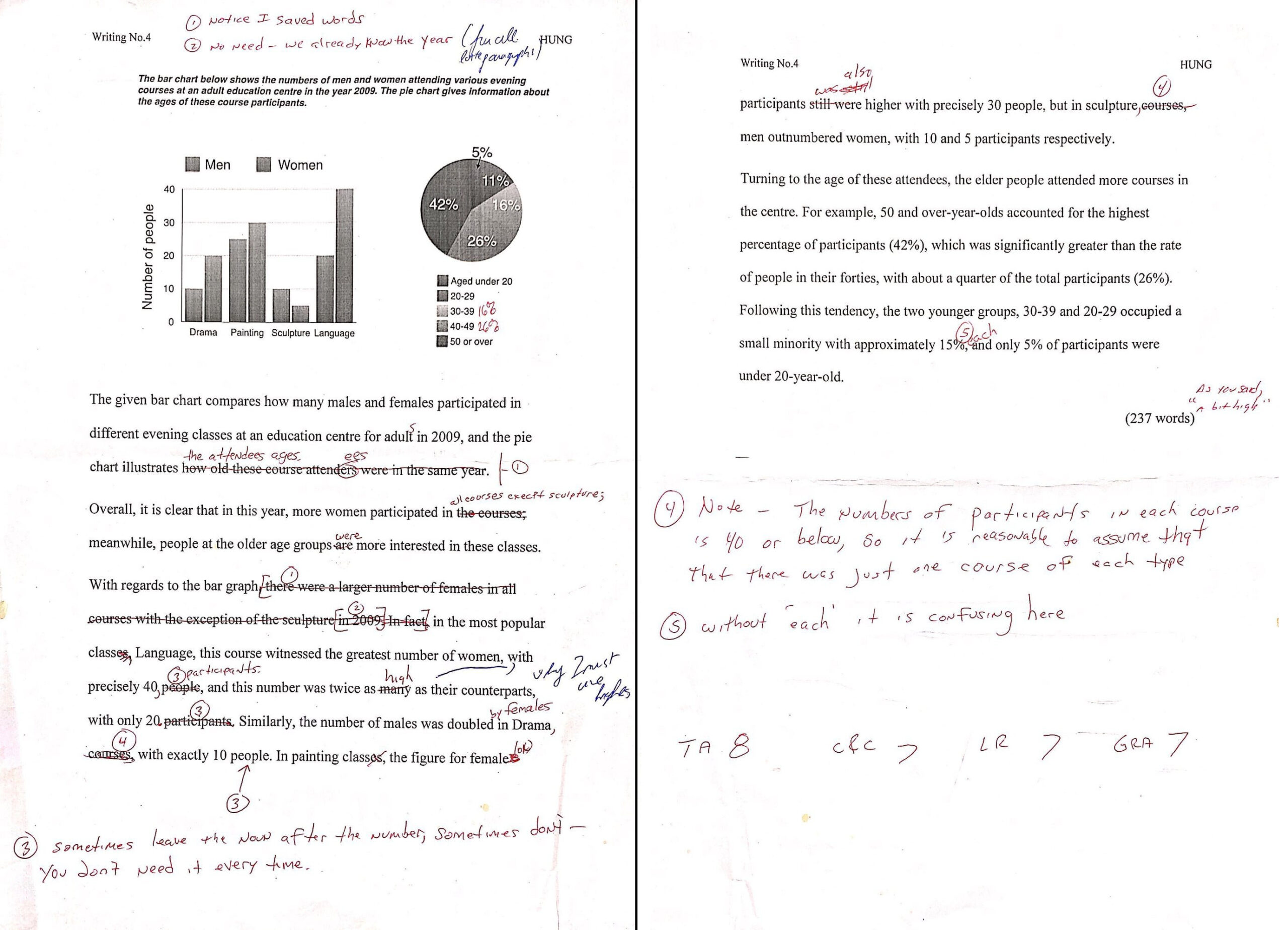 Ở câu thứ 2 của đoạn 3, do sợ bị thiếu đơn vị nên mình có rất nhiều câu lặp lại chữ “participants”, và thậm chí cố gắng paraphrase thành “people”. Nhưng theo giám khảo đã đánh dấu ở tất cả các câu với chú thích (3) “sometimes leave the noun after the number, sometimes don’t – you don’t need it everytime”. Nên ở chỗ này mình có thể bỏ đi được để tiến kiệm thời gian và công sức suy nghĩ từ đồng nghĩa.